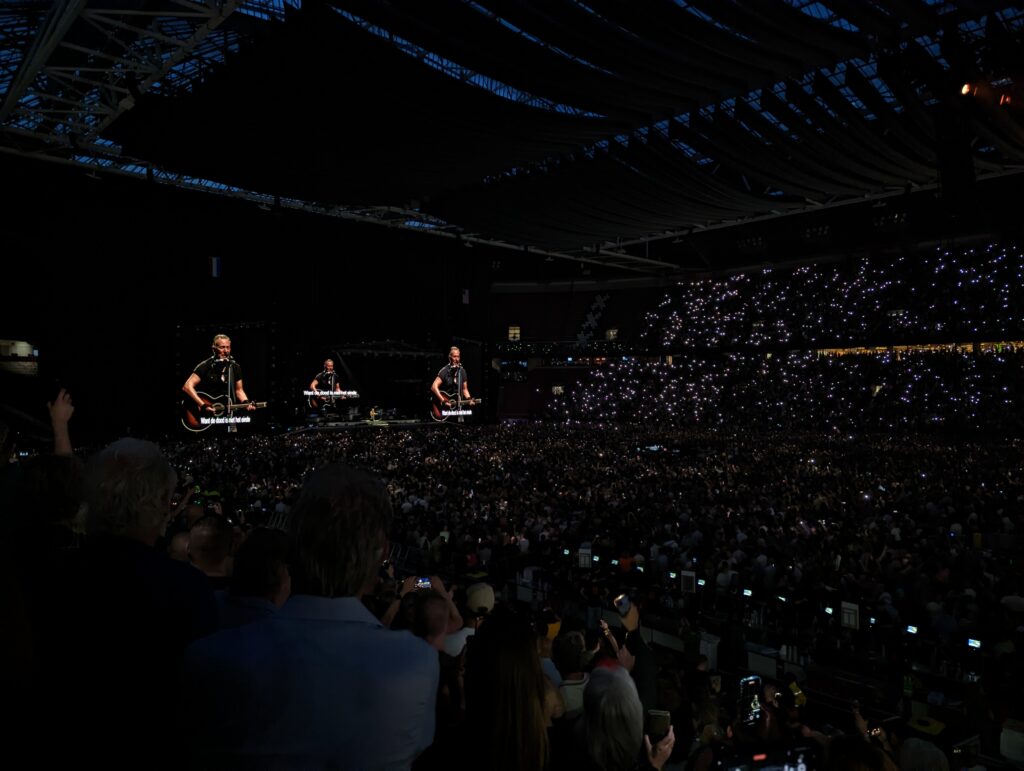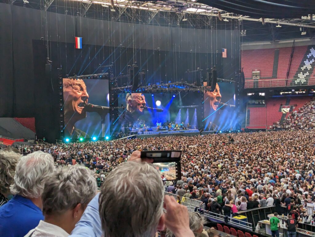 Afgelopen weekend was de dag daar. We reden naar Amsterdam en verbazingwekkend snel zaten we op onze stoeltjes in de Johan Cruijff Arena. Als fervent voetbalhater was het mijn tweede keer in een voetbalstadion (de vorige keer was voor Rammstein). Ik voelde me niet op mijn plek, maar het moest maar even. Er was geen voorprogramma, geen gedoe, geen vertraging. 19:30 kwam de band op en al snel stond Bruce zijn eerste nummer te zingen. Daar ga ik ten minste van uit, want zijn stem was totaal onhoorbaar. Een grote blur van totale muzikale chaos knalde door de speakers met de kwaliteit van een Fiat Panda radio met afgebroken antenne. Bruce’s stem werd volledig bedolven onder de kakafonie van slecht afgestelde audio. Het was ronduit vreselijk te noemen en voor de eerste paar nummers begon ik een beetje te koken van woede. Hier had ik €120 voor betaald?
